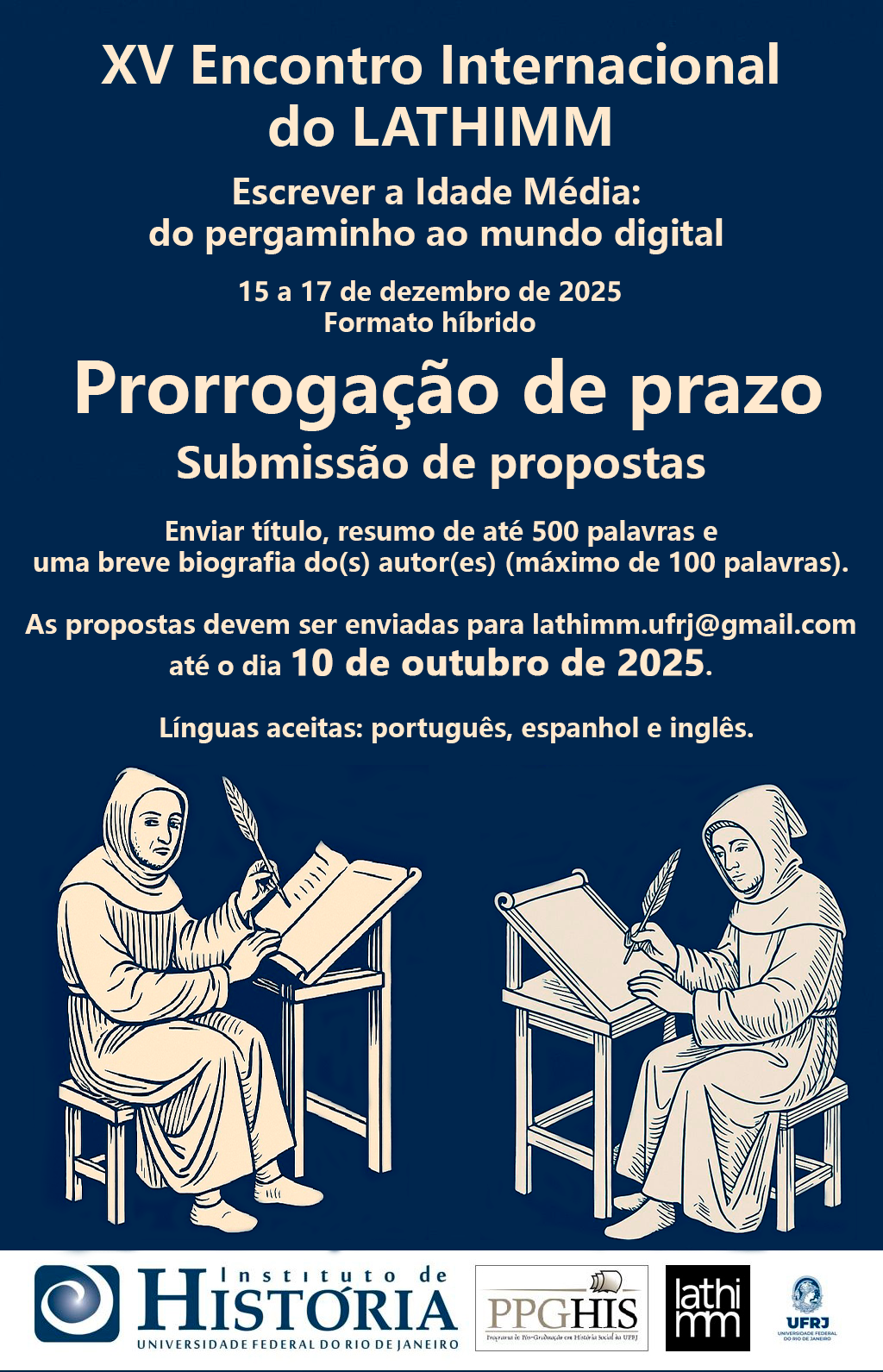 Diante dos desafios metodológicos e conceituais inerentes ao estudo das práticas escritas medievais, o Laboratório de Teoria e História das Mídias Medievais realizará, no âmbito do PPGHIS/UFRJ (e de forma híbrida), a 15ª edição de seus Encontros Internacionais. Os dias 15 a 17 de dezembro serão assim dedicados à reflexão e discussão a respeito das diferentes formas de escrever a Idade Média.